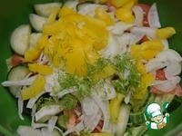 Зелень фенхеля мелко нарезать в салат. Ее немного, но не пренебрегайте ею, очень она ароматная. |
