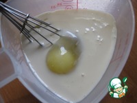 Налить ряженку в большой стакан или любую удобную для вас емкость, туда же разбить яйца и все взбить венчиком |