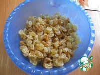На подошедшее тесто высыпаем изюм и присыпаем парой ст. ложек муки, - вмешать изюм в тесто |