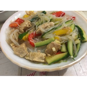 Собираем все игридиенты. Накладываем в тарелочку фунчозу, поверх неё свинину с овощами, а потом огурчики с соевым соусом.
