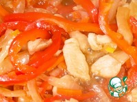 Добавить к куриному филе нарезанные овощи, соевый соус и обжарить все вместе еще около 5 минут. |