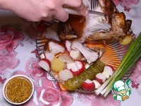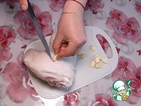 Рульку тщательно промываем. Чеснок нарезаем слайсами (на 3-4шт). Делаем надрезы в глубину на рульки и шпигуем ее чесноком. |