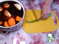 Через 2 часа добавляем к рульке нарезанный на 4 части промытый лук, 1 очищенную и порезанную морковь, 1 стебель сельдерея. |