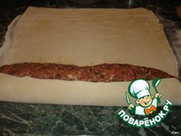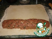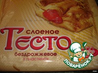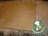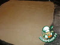 Размороженное тесто присыпать мукой и раскатать в прямоугольник (~35*45 см). |