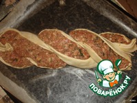 Разрезанные части аккуратно сплести и выложить на смазанный маслом и выстланный пергаментом противень. Края посильнее защипнуть. |