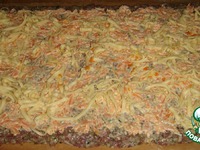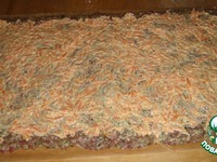 Морковь натрите на терке и смешайте со сметаной, готовую смесь выложите на фарш тонким слоем |