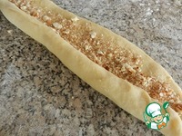 Подошедшее тесто разделить на 5 одинаковых частей. Каждую часть необходимо раскатать в длиный прямоугольник (длинная сторона где-то 25см). Посыпать начинкой из сахара с миндалем и скатать рулет. |