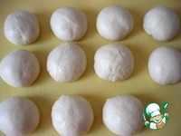 Приступаем к разделке теста, я делала не "рогалики", а "кроликов". Делим тесто на 11 частей и подкатываем каждую часть в шарик, прикрываем пленкой и оставляем минут на 10. |