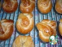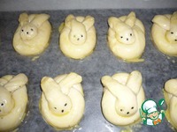 Затем "кроликов" смазываем яйцом и отправляем в духовку при температуре 180 градусов на 20 минут. |