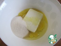 В чаше смешать творог, яйца и сахар, взбить венчиком или миксером |