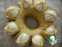 На каждый получившийся сектор положить по половине вареного яйца. Жгутики выложить крест на крест на половинки яиц. Края жгутов подогнуть под яйцо и немного придавить яичко к тесту. |