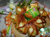 Перенести его на противень, застеленный бумагой для выпечки. Свернуть рулет в форме кольца, скрепить края. Сделать на кольце 8 разрезов, не доходя до внутреннего края кольца. |