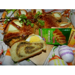 Описание: Предлагаю испечь к праздничному столу пасхальный венок с несладкой начинкой в виде куриной печени с луком, морковью и сыром... Верх нашего венка украсим яйцами...
