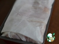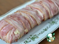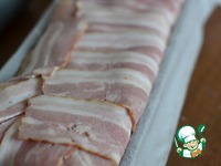 Выложить полоски грудинки так, чтобы концы свисали через край формы. |