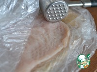 Куриную грудку нарезать, как на отбивные. Слегка отбить, прикрыв пищевой пленкой. Каждую отбивную посолить и поперчить. |