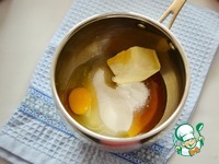 В сотейник положите яйцо, сахар, мед, соль, масло и соду |
