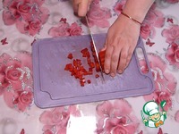 Небольшим кубиком нарезаем: сладкий красный перец, морковь, которая варилась в бульоне, буженину, куриное мясо (отделенное от костей). |