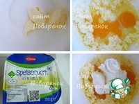 Мягкий маргарин для выпечки (или сливочное масло) взбить с сахаром, ванильным сахаром. Добавить яйца и творог, взбить до однородности. |
