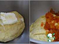 Затем добавить в тесто мягкое сливочное масло. Тщательно вымесить. И в последнюю очередь добавить в тесто цукаты. (вместе с жидкостью) Месить тесто минут 5-7. |