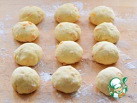 Подошедшее тесто выложить на рабочую поверхность, слегка присыпанную мукой, обмять, разделить на 12 (10...14) равных частей. |
