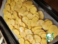 Оливковое масло, специи, соль перемешать и залить в нашу подготовленную картошку, все тщательно перемешать и выложить на противень, предварительно застелив его пергаментом. |
