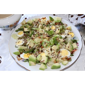 Первым делом приготовим салатную заправку: смешаем в миске йогурт (у меня домашний, можно греческий или магазинный натуральный без добавок, наконец нежирную сметану), мед, горчица, соль, темный густой бальзамический соус. Все взбить вилкой и дать постоять. Перед заправкой салата скорректируйте соус под ваш вкус, если надо подсолите, добавьте еще бальзамического соуса (его можно заменить соусом наршараб, но взять меньшее количество на начальном этапе приготовления). Авокадо нарежьте крупными кубиками и сбрызните соком лимона, чтобы уберечь от потемнения. |