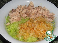 Отварное мясо мелко нарезать и смешать с редькой, луком и маслом. |
