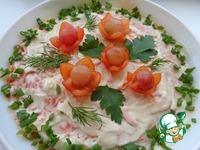 Сверху промазать майонезом и посолить оставшейся солью. Украсить по своему усмотрению. Я использовала помидоры черри, зелень петрушки и укропа, зеленый лук. Приятного аппетита! |