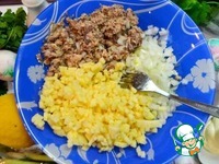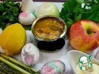 Мелко нарезаем кубиком, лук, яблоко, яйцо на средней тёрке трём, размять вилкой сардину выдавить сок лимона, цедру натереть на мелкой тёрке, добавить немного майонеза. |
