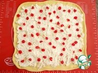 Выкладываю на тесто 1/2 часть начинки, распределяю ее, посыпаю 1/2 частью сушеной вишни. |