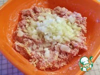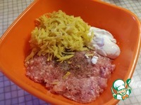 В глубокую миску выкладываем фарш, добавляем сметану две столовые ложки, натёртый картофель. Посолить и поперчить по вкусу. Хорошо перемешать. |