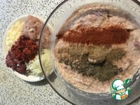 Остальное мясо перебить блендером или перемолоть в мясорубке с луком. Добавить специи, перец, сыр и оставшееся мясо. |