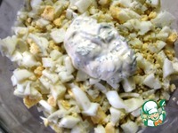 2. яйца, приправить солью и черным перцем по вкусу, смазать слой заправкой. |