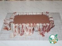 Прямоугольную форму для запекания выстелаем полосками бекона внахлест так, чтоб края свисали. |
