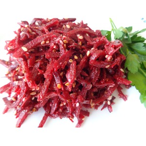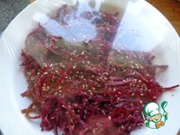 Свеклу порезать соломкой. Я воспользовалась специальной насадкой к кухонному комбайну. Добавить к свёкле кунжут, приправу, кориандр, соль, сахар, холодное оливковое масло, чеснок, уксус. |