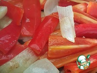 Добавить к сердечкам перец с луком и мелкорубленный чеснок. Перемешать. Досолить, если требуется. |