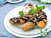 Горячие бананы обваляйте в кокосовой стружке. Выложите бананы на тарелку, дополните шариком пломбира, полейте шоколадным сиропом. Приятного аппетита!!! |