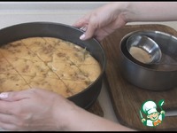 Достаем пирог из духовки, нарезаем прямо в форме на порционные куски и когда сироп немного остынет поливаем. Я вылила весь сироп, но мне кажется можно последние два половника было не выливать. |