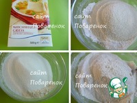 Смешать просеянную муку с манной крупой, сахаром, ванильным сахаром, солью, разрыхлителем теста. |