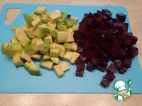 Авокадо очистить, удалить косточку, нарезать средним кубиком. Сбрызнуть лимонным соком. Свеклу очистить и нарезать средним кубиком. |