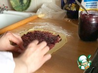 Смазываем каждый пласт теста 2 ст. л. смородинового варенья (на мой вкус, это самое подходящее варенье, так как не делает приторными рулетики, а наоборот - придает приятную кислинку) |