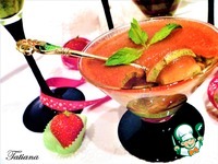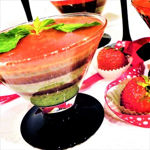 Желатин из одной чашки влейте в мятный йогурт, желатин из второй чашки в клубничное пюре. В небольшие креманки (бокалы)слоями разлейте йогуртовое и клубничное желе. Каждому слою надо немного "закрепиться"в холодильнике. Для удобства приготовления, поставьте креманки на небольшой поднос или на разделочную доску. |