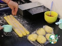 И формирую обычную косичку из трех жгутов. Сверху присыпаю, потом обваливаю в сахаре с корицей. Пропирции : 20 гр. сахара, 0,5 ч. л. корицы, щепотка соли. |
