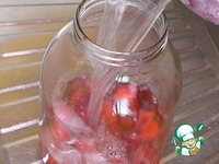 Заливаем сиропом. Для того, чтобы банка не лопнула, делаю это на металлической мойке. |