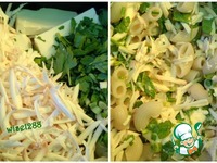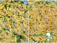 Включить духовку разогреваться до 200 градусов. В горячие макаронные изделия положить размягченное сливочное масло, петрушку, зеленый лук, половину сыра. Перемешать. |