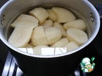 Сделать из картофеля обычное пюре. Хорошо растолочь, чтобы не было комочков. И отдельно поставить вариться 3-4 яйца. |