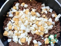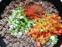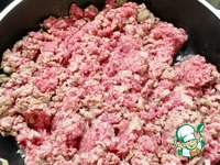 Добавляем в зажарку фарш. Разбиваем его лопаточкой, чтобы он не взялся комками. |