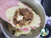 Картошка должна служить как бы тестом. Из нее лучше всего лепить, когда она в меру горячая (чтобы можно было удержать в руке и не обжечься). В середину выкладываем приготовленный фарш. |