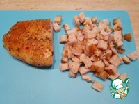 Филе остудить и нарезать средним кубиком. |