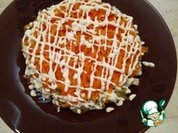 Третий слой - морковь (на крупной терке), сеточка заправки. |
